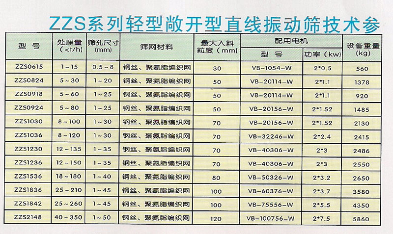 ZZS系列直线振动筛是一种以振动电机为激振源的新型振动筛分设备,开发有轻型筛和重型高效筛两大系列,其中轻型筛通常是水平安装,且多采用编织筛网,广泛应用于冶金、矿山、煤炭、化工、建材、耐火、食品加工等各行业对中、小颗粒物料及各种粉状物料的分级、脱水、脱介;而重型高效筛一般采用5°-15°倾角安装,且多采用筛板,广泛应用于冶金、矿山、煤炭、化工、建材、耐火等各行各业对大、中颗粒物料的分级。